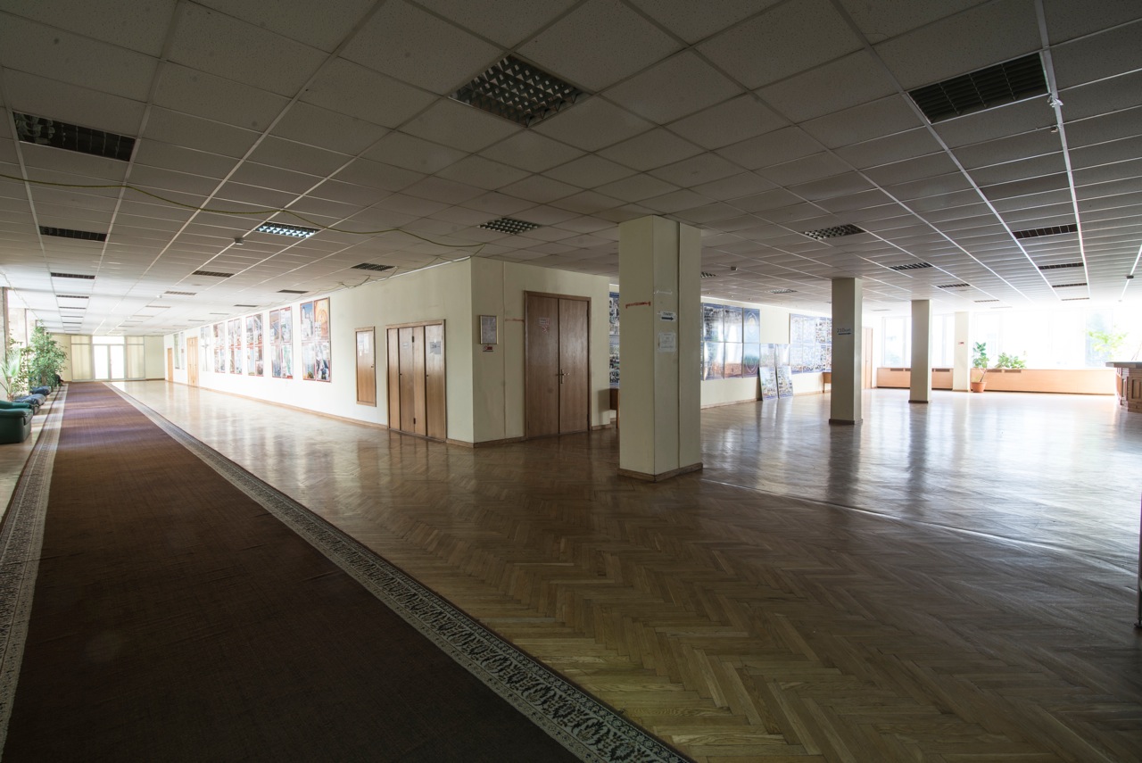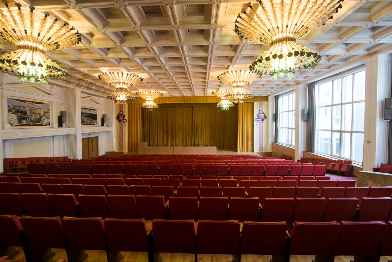 Актовый зал оснащен: системой кондиционирования, звукового сопровождения, стационарными микрофонами, наличием киноэкрана и комфортными креслами.