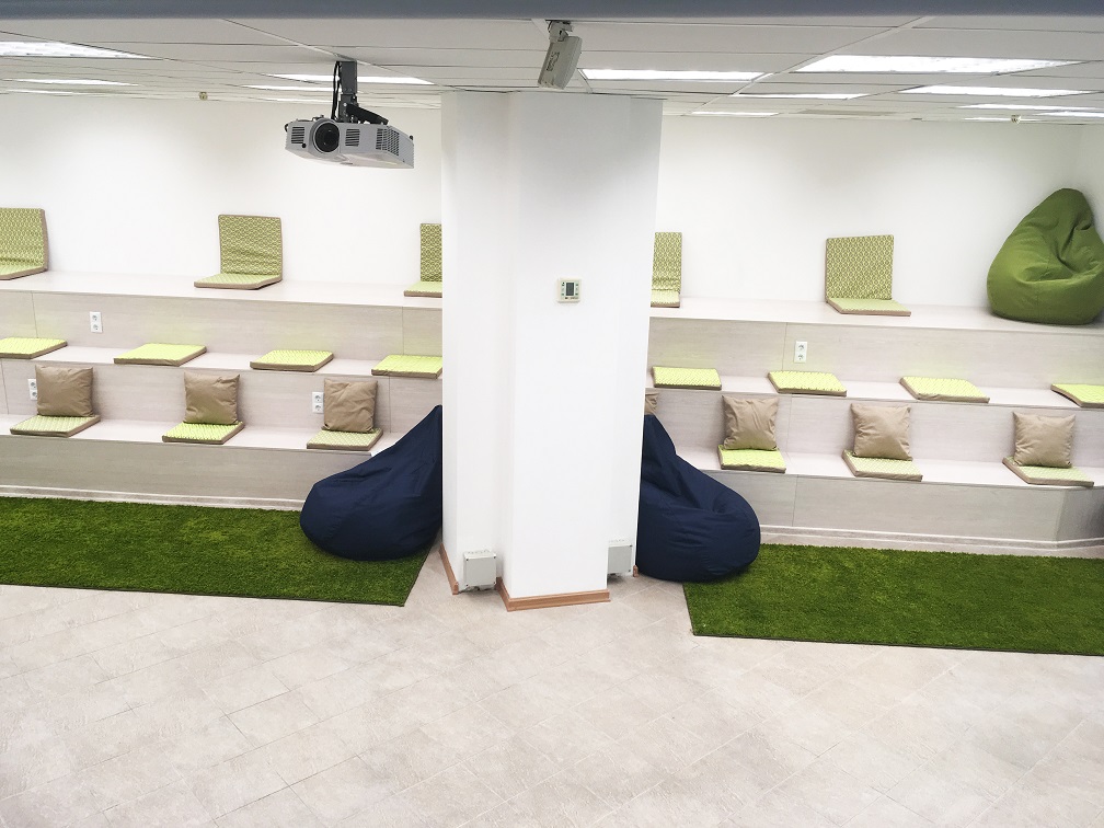 Залы обустроены следующей мебелью: трибуны, столы, стулья, мешки. Помещения отлично подходят для проведения различных ивентов (конференций, тренингов, семинаров или просто коворкинга).