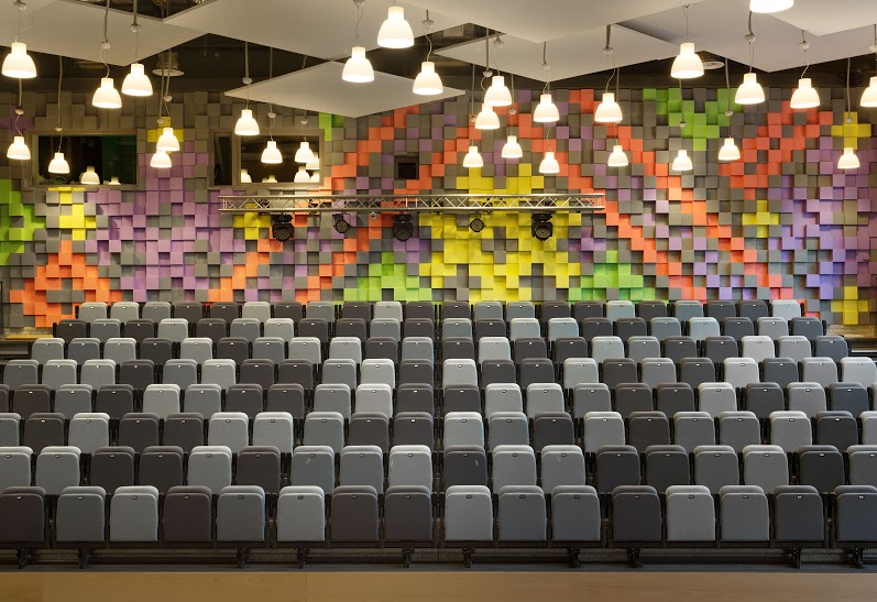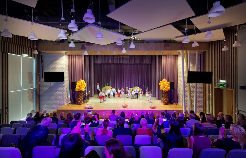 Конференц-зал расположен на втором этаже здания Новопечерской Школы. Есть сцена, раздвижные шторы, система раскладных сидений, 2 дополнительные комнаты для реквизита.