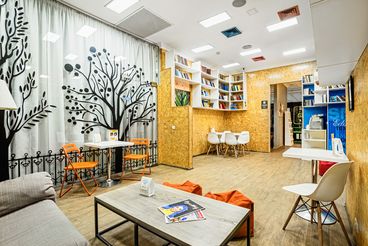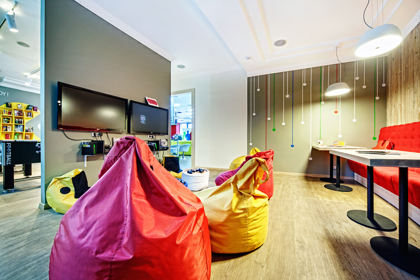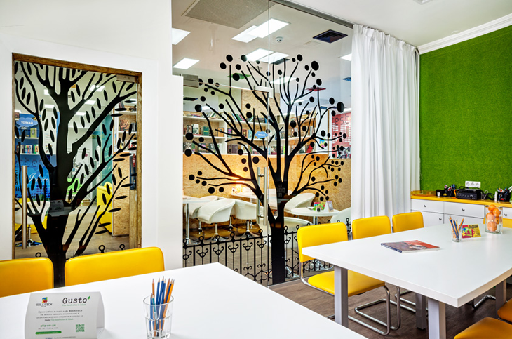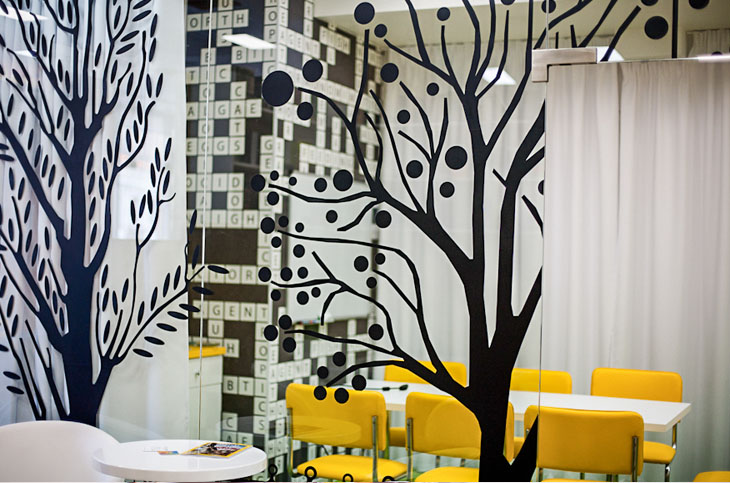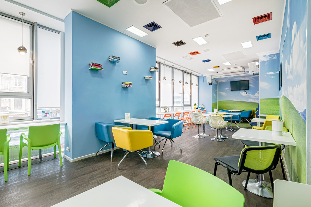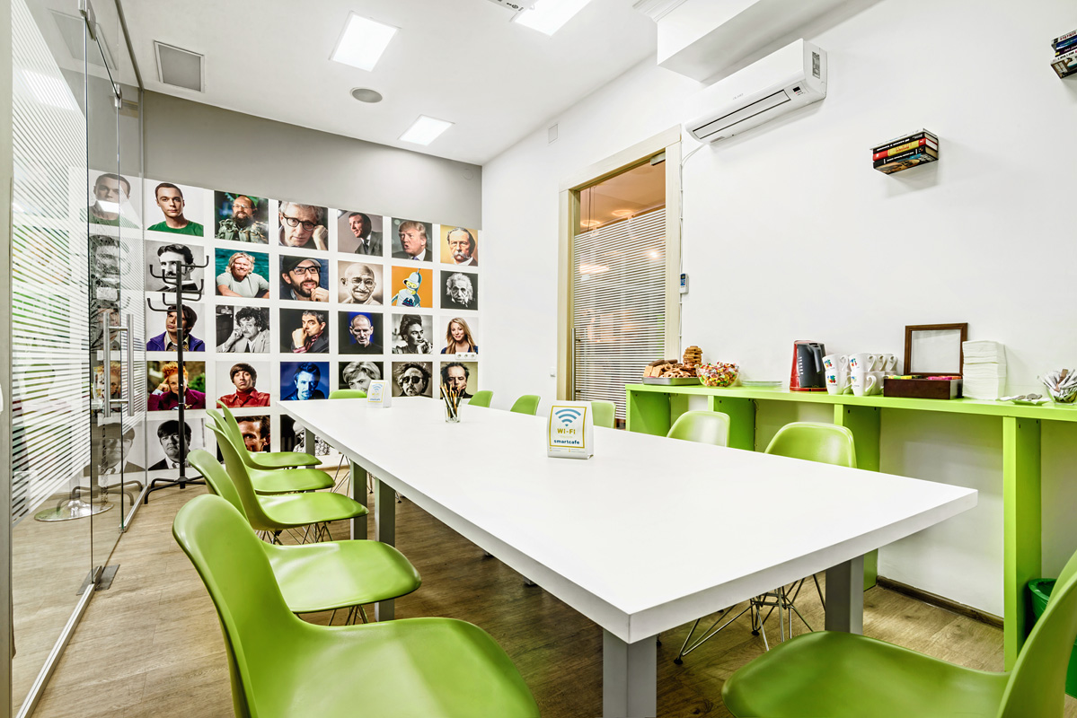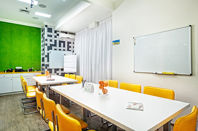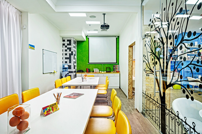 Кімнати для переговорів відрізняються креативним і яскравим дизайном інтер'єру. Можна перекривати скляну стіну за допомогою штори.