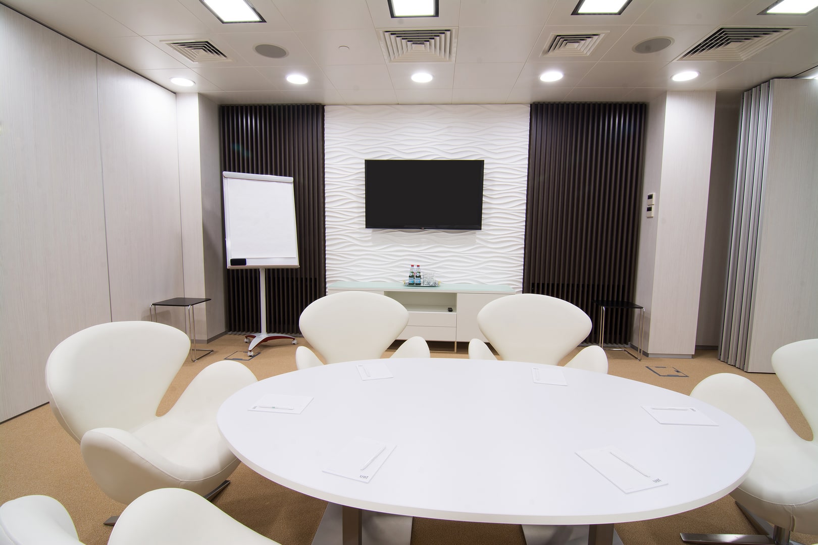 Мобільні перегородки допоможуть організуваті одночасно кілька різніх зустрічей: Тимчасовий офіс для зустрічі з бізнес партнерами, виїзна нарада, переговорні кімнати з можлівістю проведення відеоконференції та телемосту.