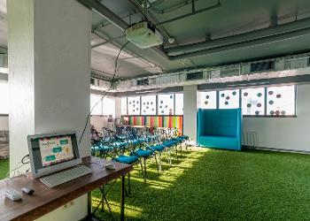 Зал оборудован современной аудио-видео системой, которая позволяет транслировать события медиа центра в формате телепрограммы (онлайн монтаж, титрование спикеров) в HD качестве, а также осуществлять профессиональную запись и монтаж видео (создание информационных сюжетов для ТВ, создание виде курсов / уроков / тренингов / семинаров для дальнейшего использования, нарезка коротких фрагментов для распространения в социальных сетях).